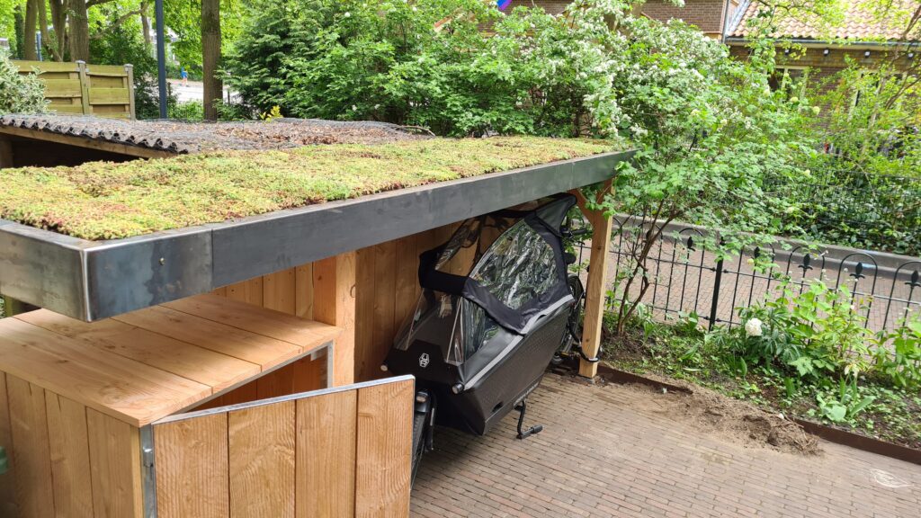 Dit unieke MYWOOD bakfiets model is samen met een klant ontwikkeld. Met een breedte van 400 cm is het geen klein bouwwerk. Echter door de constructie met een zwevend dak heeft het ontwerp een open karakter. De afwerking met Cortenstaal geeft een mooi contrast met het organische materiaal Douglashout. Aan de linkerzijde is onze kliko ombouw met kantelsysteem geïntegreerd. Naast een berging voor de Urban Arrow bakfiets is de lelijke duo-kliko weggewerkt. Het sedumdak maakt het ontwerp helemaal af. Wat een plaatje!
