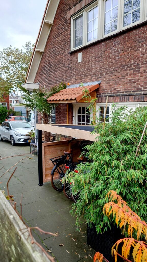 Deze fietsenberging model ROME hebbben we uitgevoerd in de stijl van de kliko-ombouw. De zwarte staanders in combinatie met de blanke Zweeds rabatdelen vormen een mooi geheel. Deze uitvoering heeft een formaat van 225 (b) x 195 (d) x 155 (h) cm.