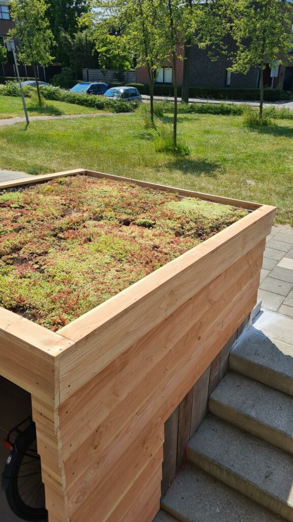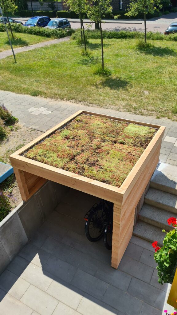 Deze fietsenberging hebben wij in 1 dag geïnstalleerd. Het frame van 85 x 85 mm balken heeft voldoende draagkracht voor het mooie sedum groendak. De fietsenschuur heeft voldoende ruimte en met 225 cm diepte zijn de fietsen voor de volle 100% beschermt tegen de regen. Doordat de tuin verdiept ligt is het sedumdak perfect zichtbaar en wanneer het hegje voor de schuur geplaatst wordt zie je niet anders dan groen. Wat een aanwinst voor de buurt en wat fijn dat de fietsen vanaf vandaag niet meer buiten in de regen staan.