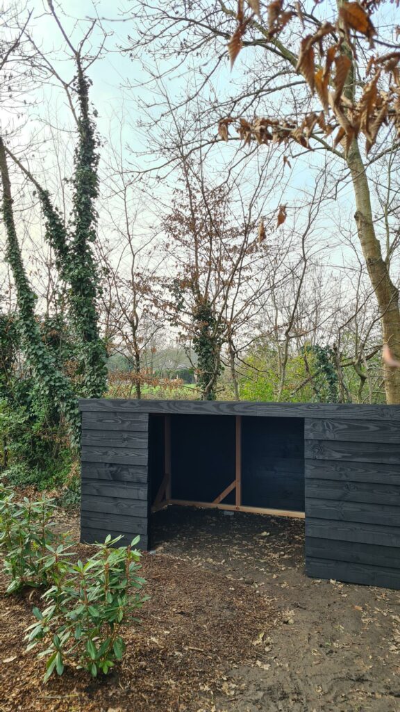 In dit bosrijke gebied nabij Antwerpen plaatsten wij deze fietsenschuur met haardhoutopslag. Dit model is 400 cm breed en aan de rechter zijde is een haardhoutopslag van 79 cm diep. De uitdaging bij het installeren was de ondergrond. In de omgevingswet staat dat er geen enkele verharding gebruikt mag worden. Wij hebben de fietsenschuur op betonbanden gezet en in en rond de fietsenschuur wordt de bodem bedekt met boomschors. Het is soms even puzzelen maar MYWOOD heeft altijd een oplossing.