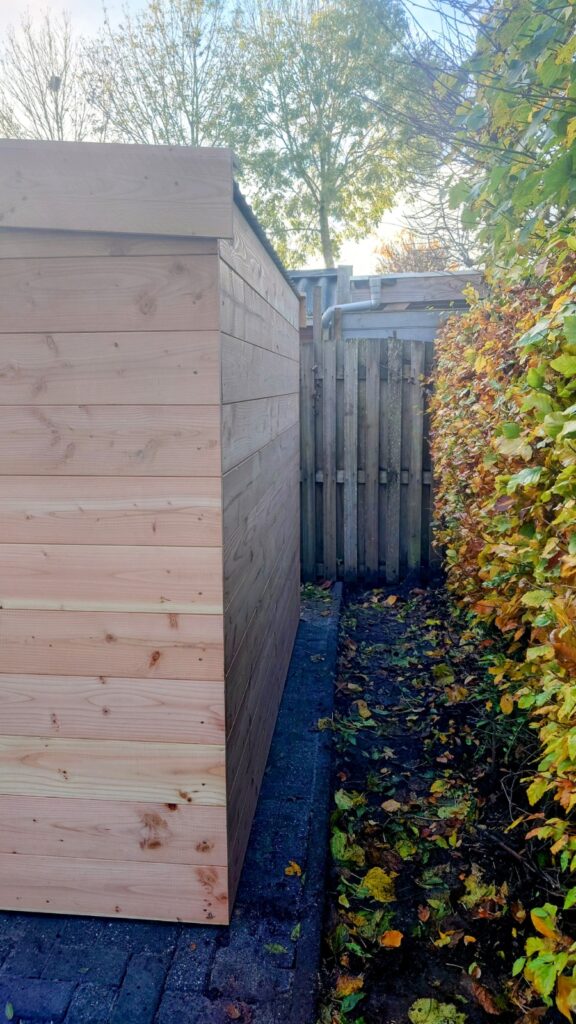 Het model NEW YORK uitgevoerd met geschaafd blokhutprofiel geeft de fietsenschuur een natuurlijk en modern uiterlijk. Het model heeft een Antraciet metalen dak. Voor deze klant in Groningen hebben we de hoogte aangepast zodat er volledige sta-hoogte is in de fietsenschuur.