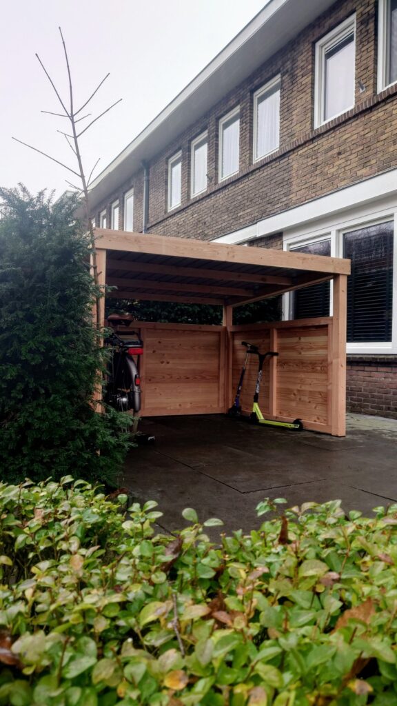 We hebben een mooie Fietsenschuur! Goed advies van Roderik, snel en goede kwaliteit. Precies gepast gemaakt voor onze voortuin met plek voor fietsen en kliko’s.