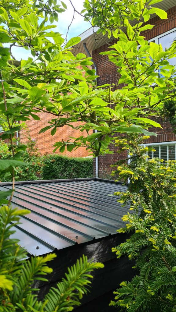 In deze voortuin installeerden wij ons populaire fietsenschuur model Haarlem in het zwart. Met een hoogte van 155 cm en een zeer slanke dakopbouw blijft het een klein schuurtje. Toch biedt deze fietsenschuur ruimte voor 5 fietsen. Weer een super snelle levering en een prachtig resultaat! Afmetingen van de getoonde fietsenschuur: 225 (b) x 195 (d) x 155 (h) cm.