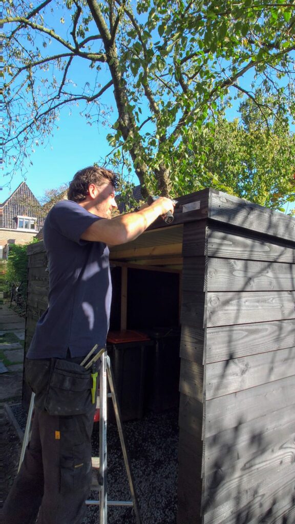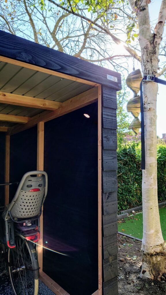 Deze klant uit Monnickendam had een aantal wensen voor een nieuwe fietsenschuur; uiteraard een plek voor de fietsen, plek voor 4 kliko’s en een haardhoutopslag. Wij wisten het model NEW YORK zo aan te passen dat al deze wensen verwerkt konden worden. De afwerking met zwart Zweeds rabat is echt heel mooi. Deze geweldige achtertuin in Monnickendam had het voldoende ruimte en de nieuwe fietsenschuur paste perfect tussen al het groen.