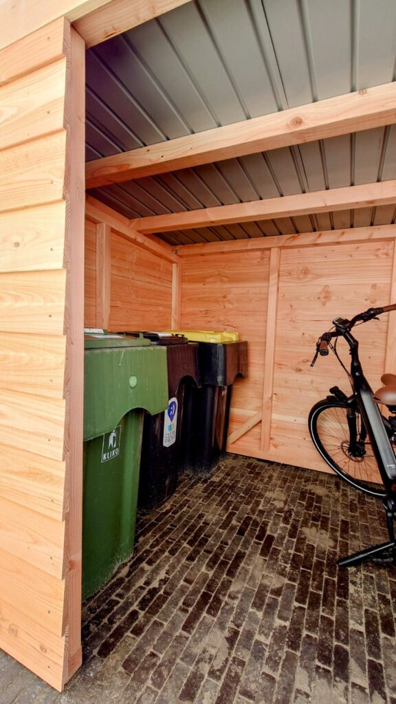 Het basis model NEW YORK in deze tuin in Mijnsheerenland. De fietsenschuur heeft naast plek voor 4 fietsen ook ruimte voor drie grote 280 liter kliko’s. Het blanke Zweeds rabat in combinatie met het antraciet metalen dak geven de NEW YORK een super mooi uiterlijk. Het basis model heet een formaat 270 (b) x 200 (d) x 180 (h) cm.