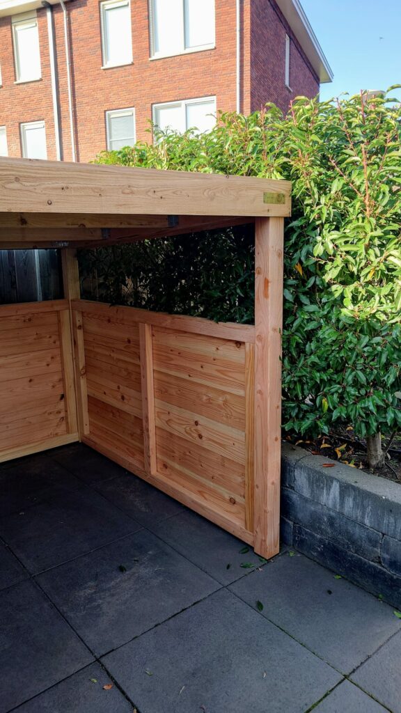 In deze achtertuin in Alphen aan de Rijn heeft de trampoline plaats gemaakt voor een nieuw fietsenschuurtje. Het model ROME hebben we op maat gemaak zodat deze strak in de bestaande situatie past. Aan de achterzijde hebben we een dakgoot geinstalleerd zodat het hemelwater netjes in de plantenbak loopt ipv tegen de schutting.