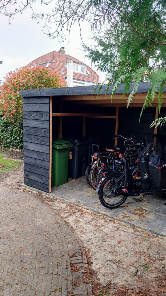 Wat een knaller van een fietsenschuur. Deze NEW YORK – XL hebben wij geinstalleerd in de achtertuin van onze klant in Aerdenhout. Naast voldoende ruimte voor de bakfiets, fietsen en de kliko’s hebben wij ook een plank gemaakt voor de tuinkussens. Deze kunnen boven de kliko’s op de plank geplaatst worden.