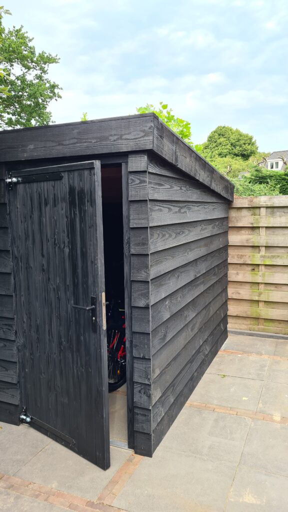 De fietsenschuur staat op een perceel dat in een punt loopt. De fietsenschuur is helemaal op maat gemaakt en heeft maar twee 90 graden hoeken. De fietsenschuur loopt met de schuine lijn mee van het perceel. De afsluitbare deur, het sedum groendak en het zwarte Zweeds rabat geven de fietsenschuur een luxe uitstraling.