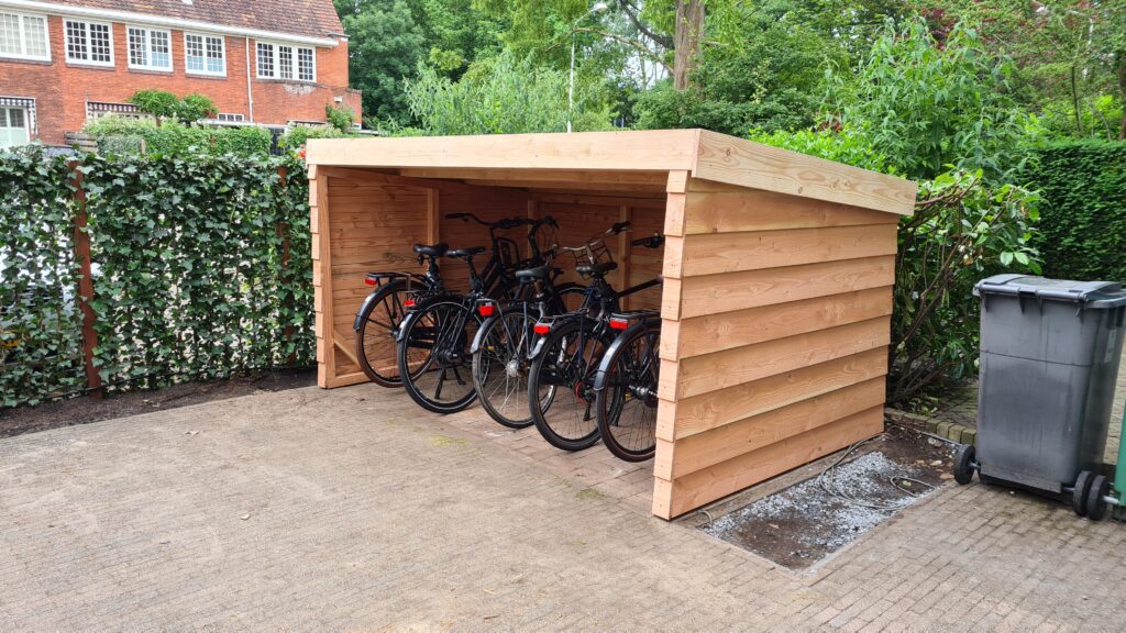 Deze fietsenschuur van maar liefst 300 cm breed biedt voldoende ruimte voor 5 tot 8 fietsen. Het dak is afgewerkt met EPDM dakbedekking zodat de fietsen de komende jaren een droog plekje hebben in deze voortuin in Overveen,