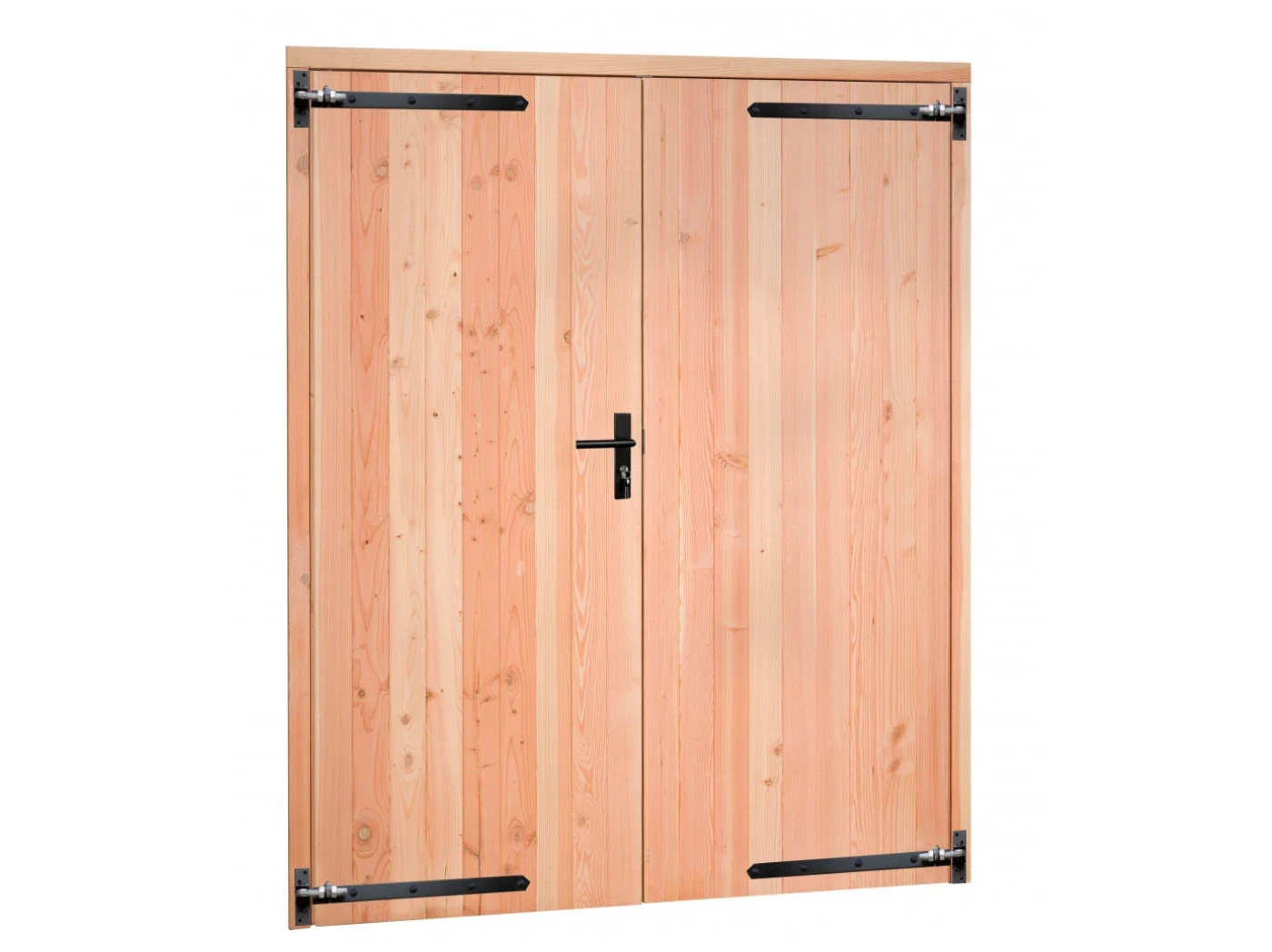 Deze optionele dubbele deur van hoogwaardig Douglas hout (201×169 cm) is perfect voor tuinhuizen, bergingen of schuren waar je extra brede toegang wilt. Dankzij de dubbele vleugels verplaats je eenvoudig grotere objecten, zoals fietsen, tuinmeubelen of gereedschap.
