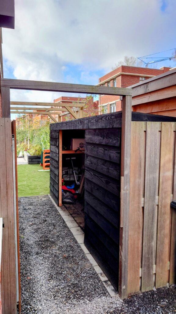 Deze tuinkast op maat installeerden wij in Voorburg. De tuinkast heeft een breedte van 400 cm en is 100 cm diep. Wij hebben aan beide kanten een plank gemaakt voor het opslaan van de tuinkussens. Onder de planken is er plak voor de fietsen.