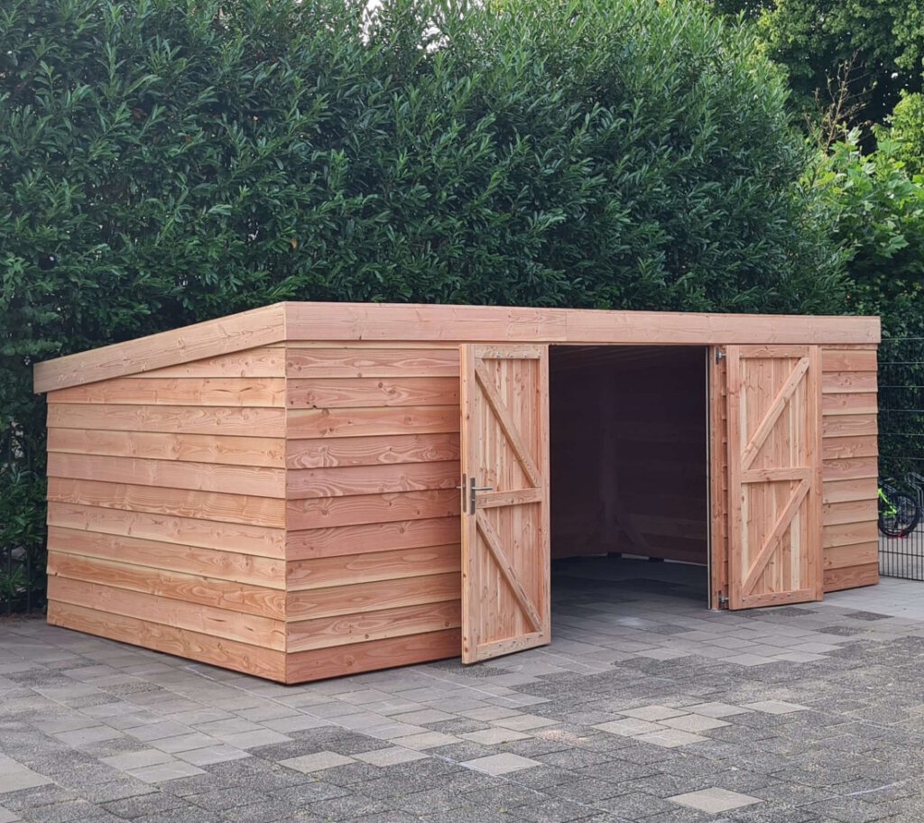 Voor een basisschool in Overveen plaatsten wij deze XL schuur in slechts 1 werkdag. Werken met gevaarlijke machines op een schoolplein waar kinderen spelen is niet ideaal. MYWOOD heeft een modulaire XL schuur ontwikkelt die wij in 7 delen meenemen en deze op locatie aan elkaar bevestigen. Door deze bouwmethode hebben we geen zaagmachines nodig op locatie wat de veiligheid op de bouwplaats vergroot. Nog een groot voordeel is dat de productie uren vooral in de werkplaats gemaakt zijn en dat we dus maar rond de 8 uur bouwoverlast veroorzaken op het schoolplein. De reductie van bouwtijd en de wijze van bouwen zonder gevaarlijke machines is zeer aantrekkelijk voor bijvoorbeeld scholen.
